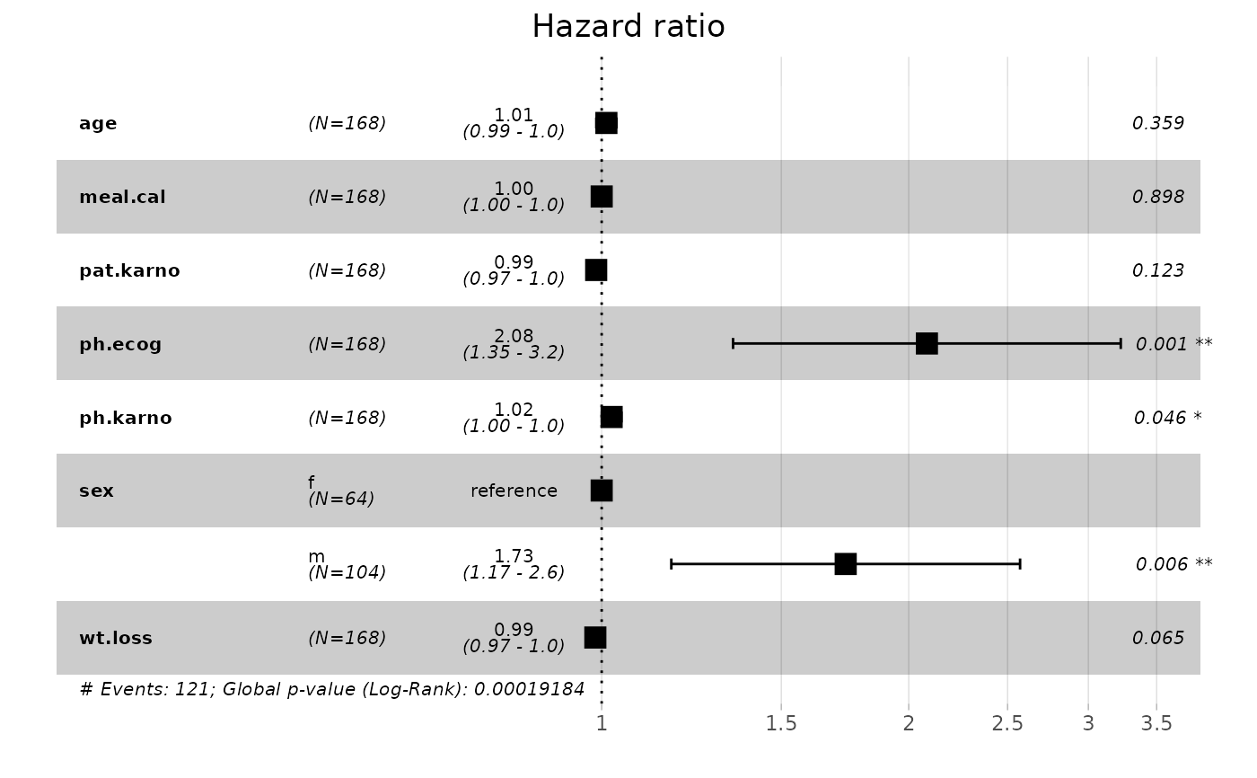 This plot displays the estimated hazard ratios (HRs) and their confidence